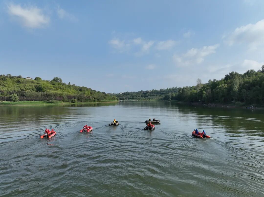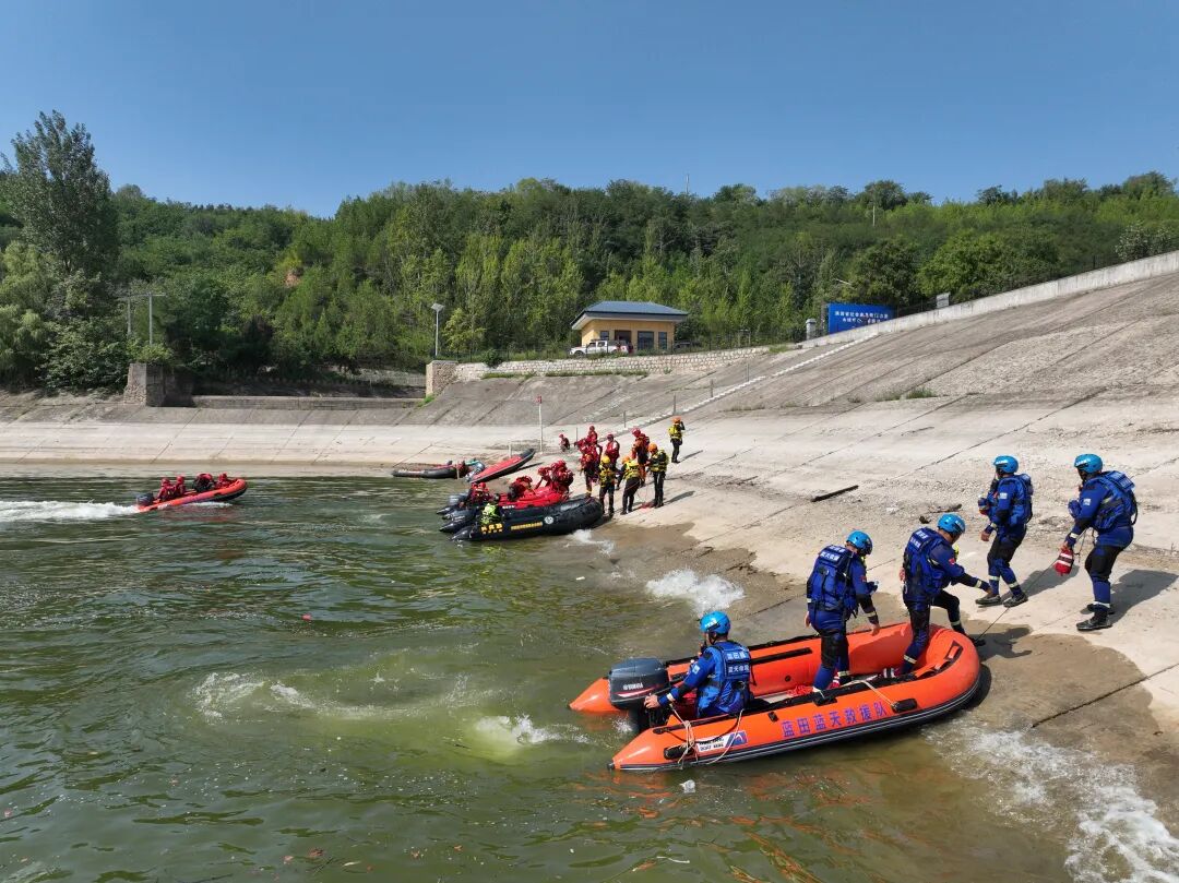水域救援演练现场设在蓝田县鹿塬水库,模拟野外救援真实场景,5支社会应急救援队伍共50名队员参加演练,重点训练水域人员搜救、绳索横渡救援、翻舟自救等科目。